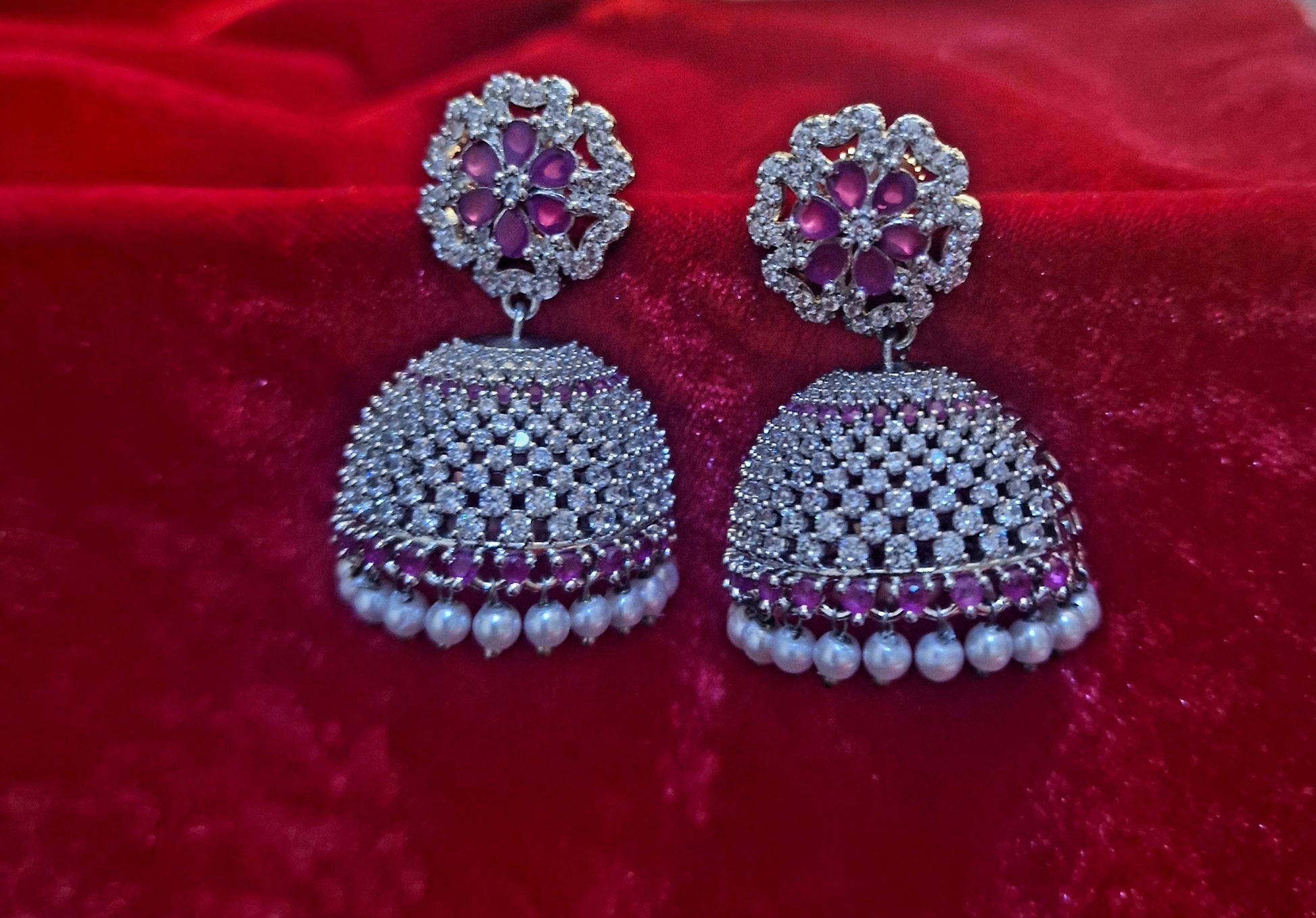 Delight in the ethereal charm of our AD Silver Jhumka. Crafted with precision, the shimmering allure of silver harmonizes flawlessly with the brilliance of American Diamonds, creating a dance of light with every subtle movement. Drawing inspiration from traditional designs, this Jhumka offers a modern touch to an age-old classic. Perfect for those who value the marriage of tradition and contemporary elegance, this piece promises to be the sparkling highlight of any ensemble, evoking admiration and timeless grace.